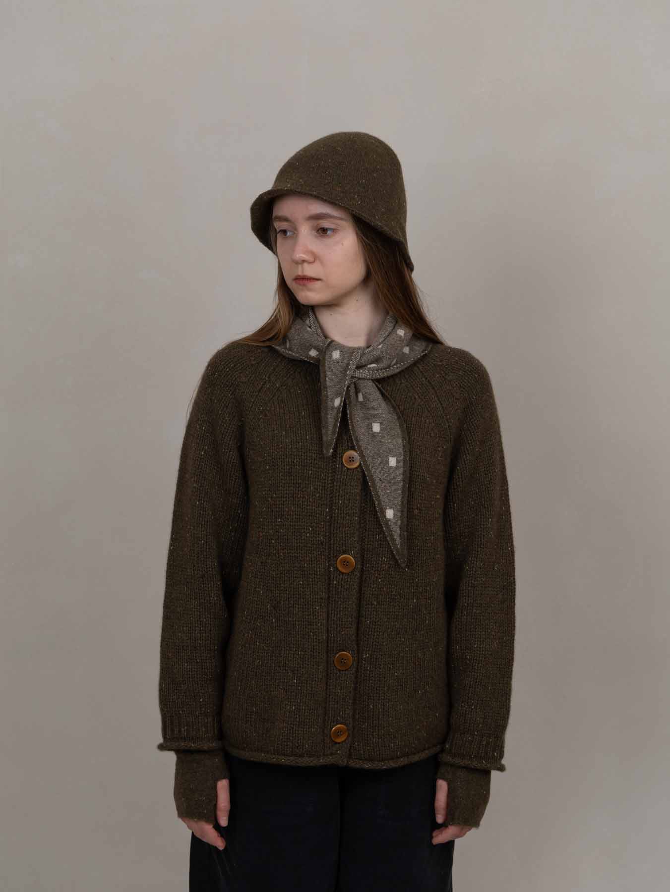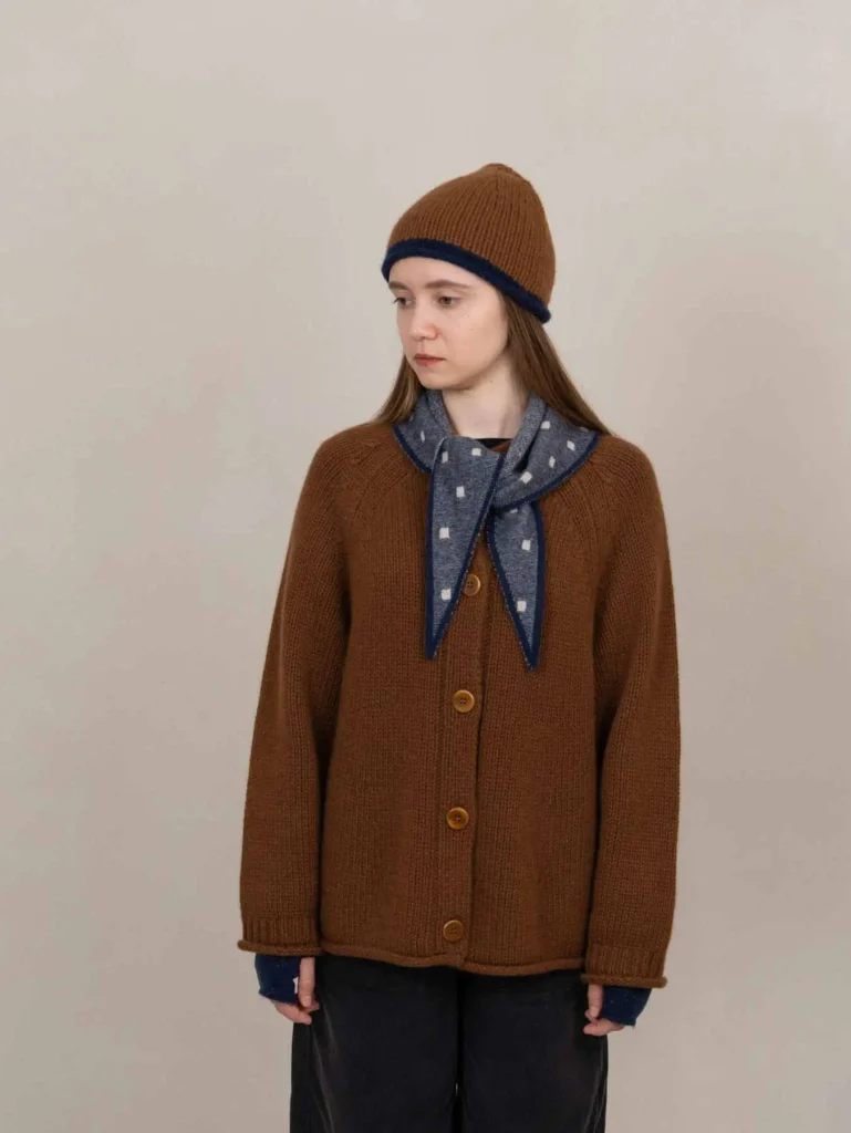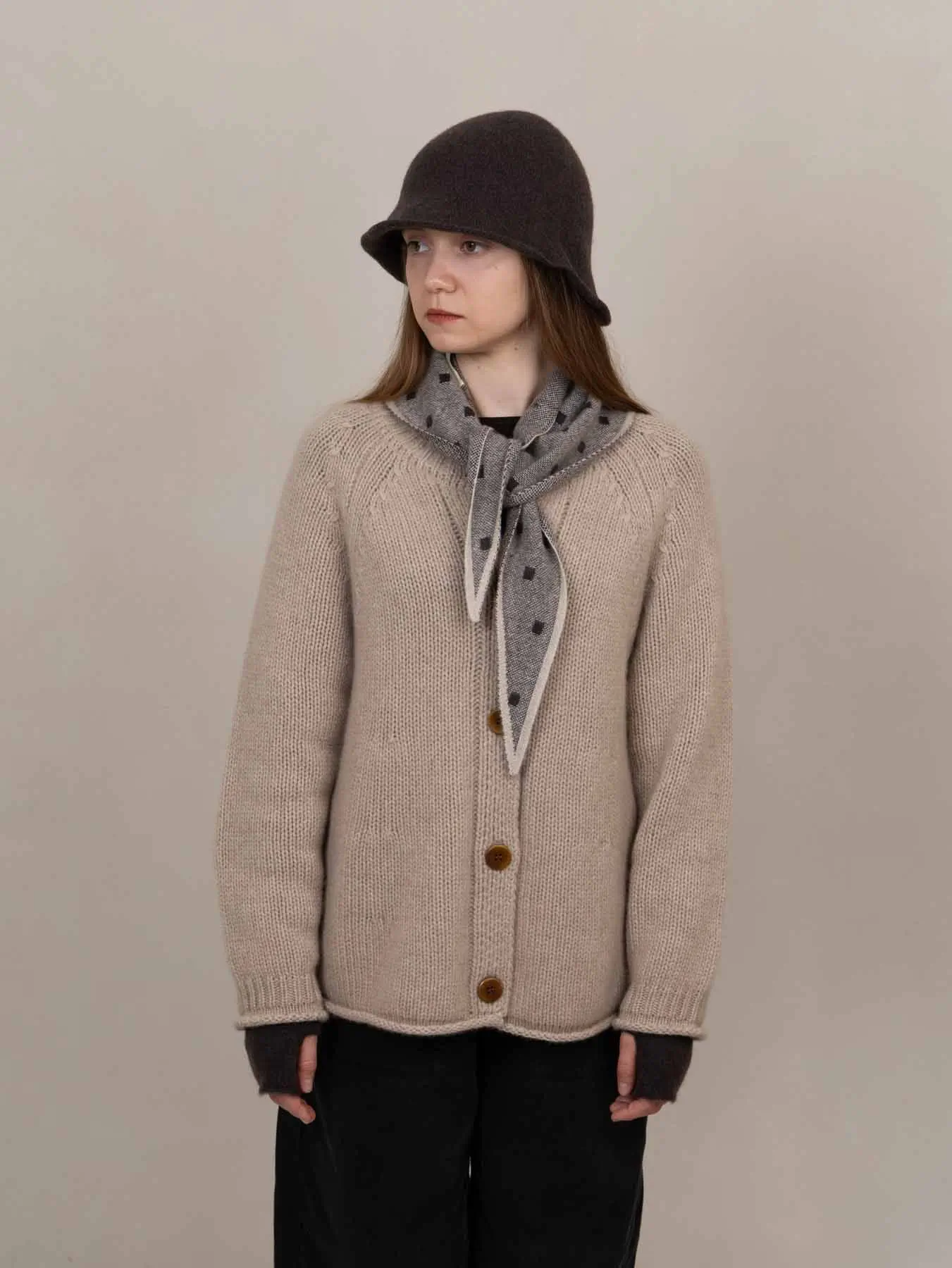 This is a relaxed, casual-fit cardigan designed for everyday wear. The buttons are made from natural palm fruit shell, giving each one its own subtle variation in tone. The knit has a medium-loose density, making it ideal for layering — warm without feeling heavy or bulky.