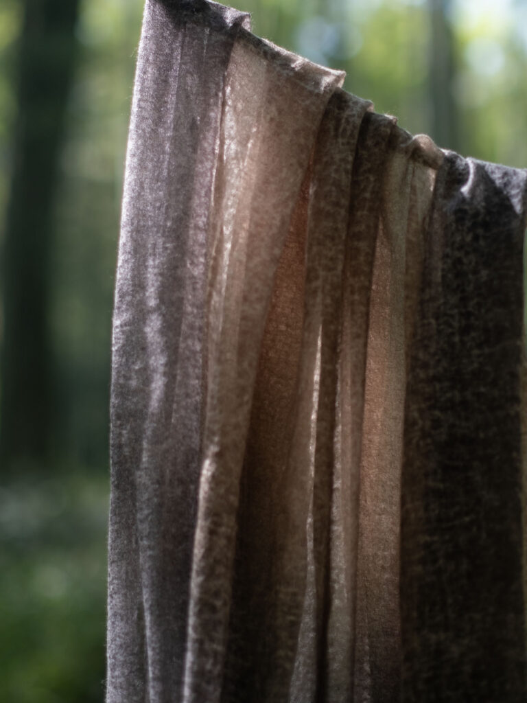 Because of the open structure, gauzy cashmere has more air trapped between fibres, making it warm despite being thin. It is very soft, with many of our clients experiencing the “wow” effect when touching it for the first time. They often describe its delicate elegance as “ethereal”, “airy”, or “like touching a cloud”.