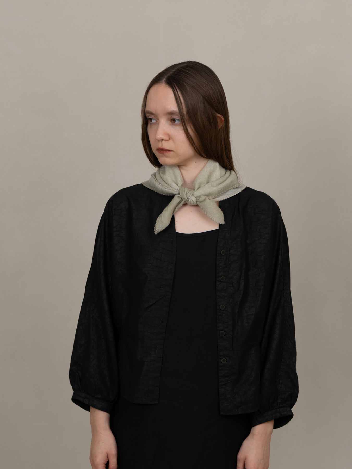 Muse is lighter than a feather and softer than a kiss. It is designed to carry you from early spring through late autumn. Hand-dyed in a soft green tone, it creates gentle, natural variations and arrives with an embroidered storage pouch. This foulard is a 60 × 60 cm square, made from 100% cashmere.