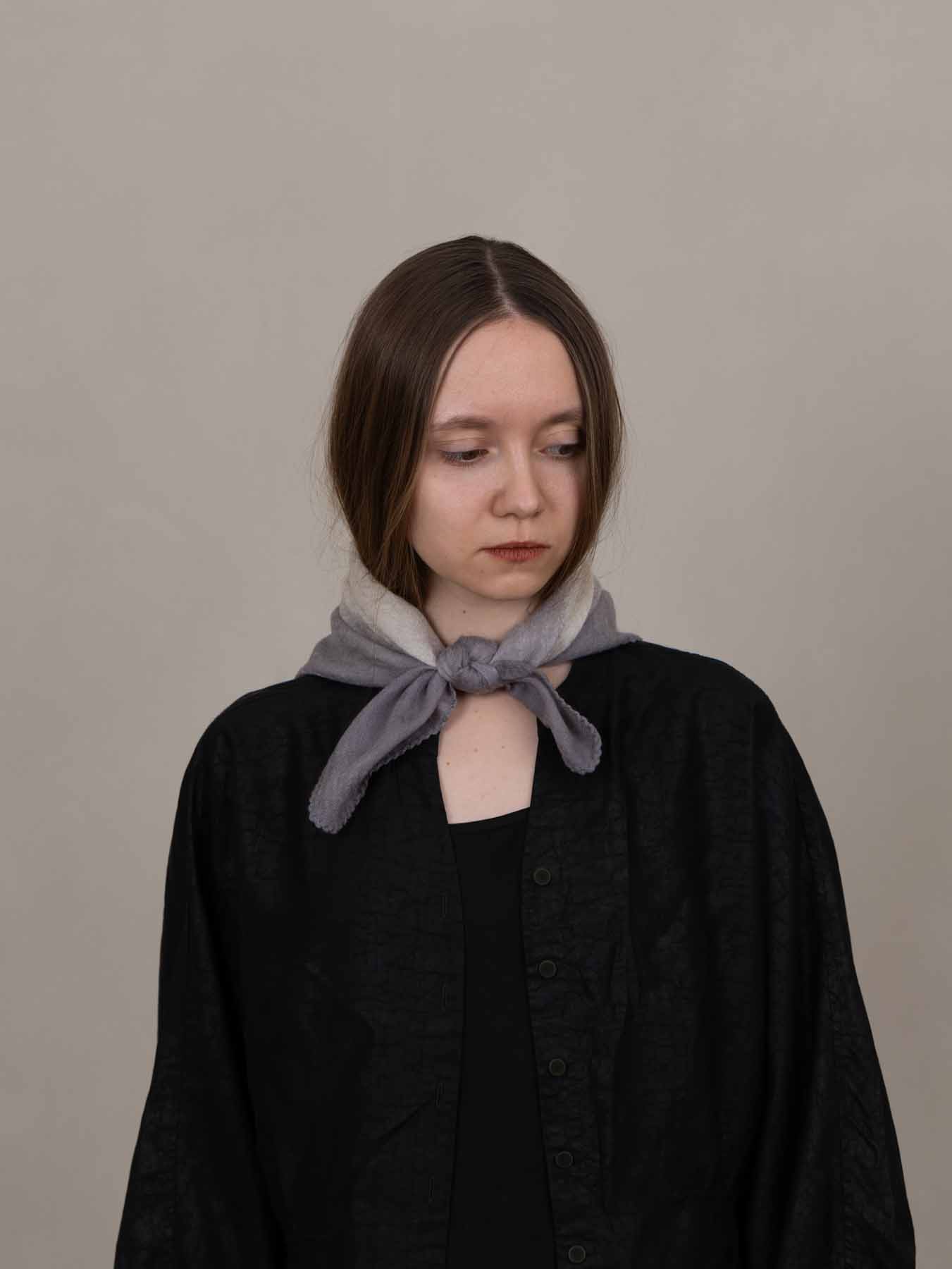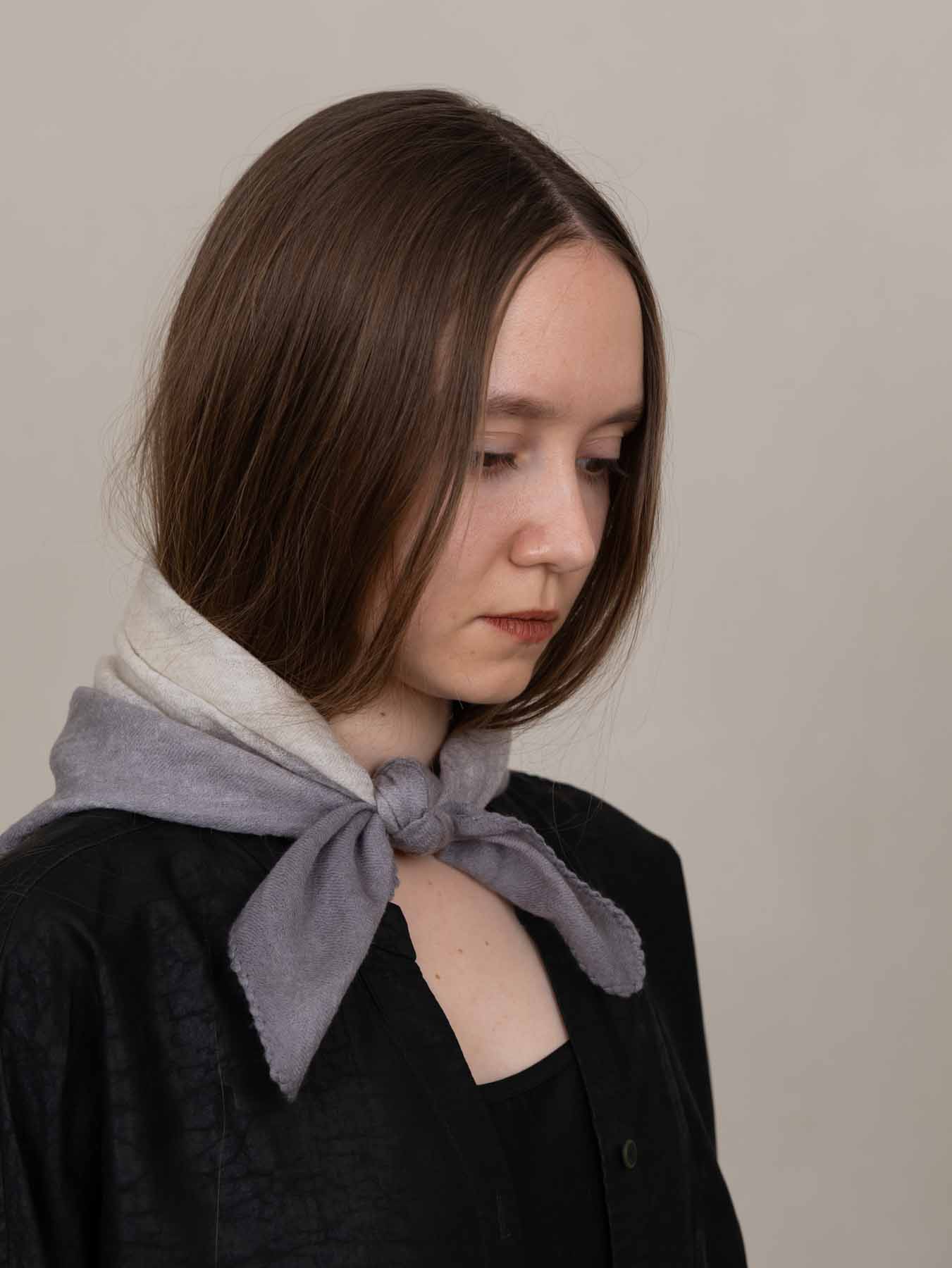 Muse is lighter than a feather and softer than a kiss. It is designed to carry you from early spring through late autumn. Hand-dyed in a soft grey tone, it creates gentle, natural variations and arrives with an embroidered storage pouch. This foulard is a 60 × 60 cm square, made from 100% cashmere.