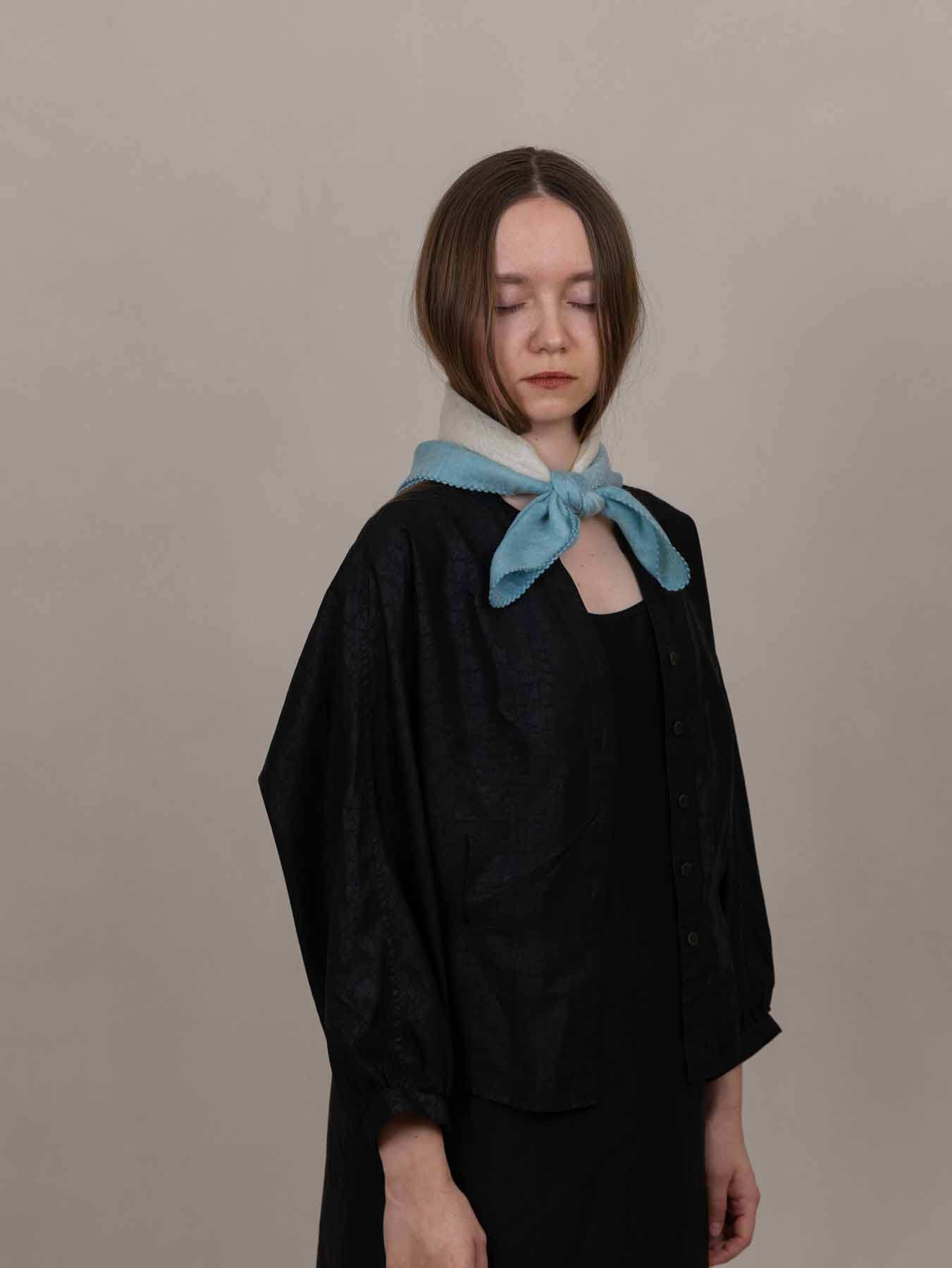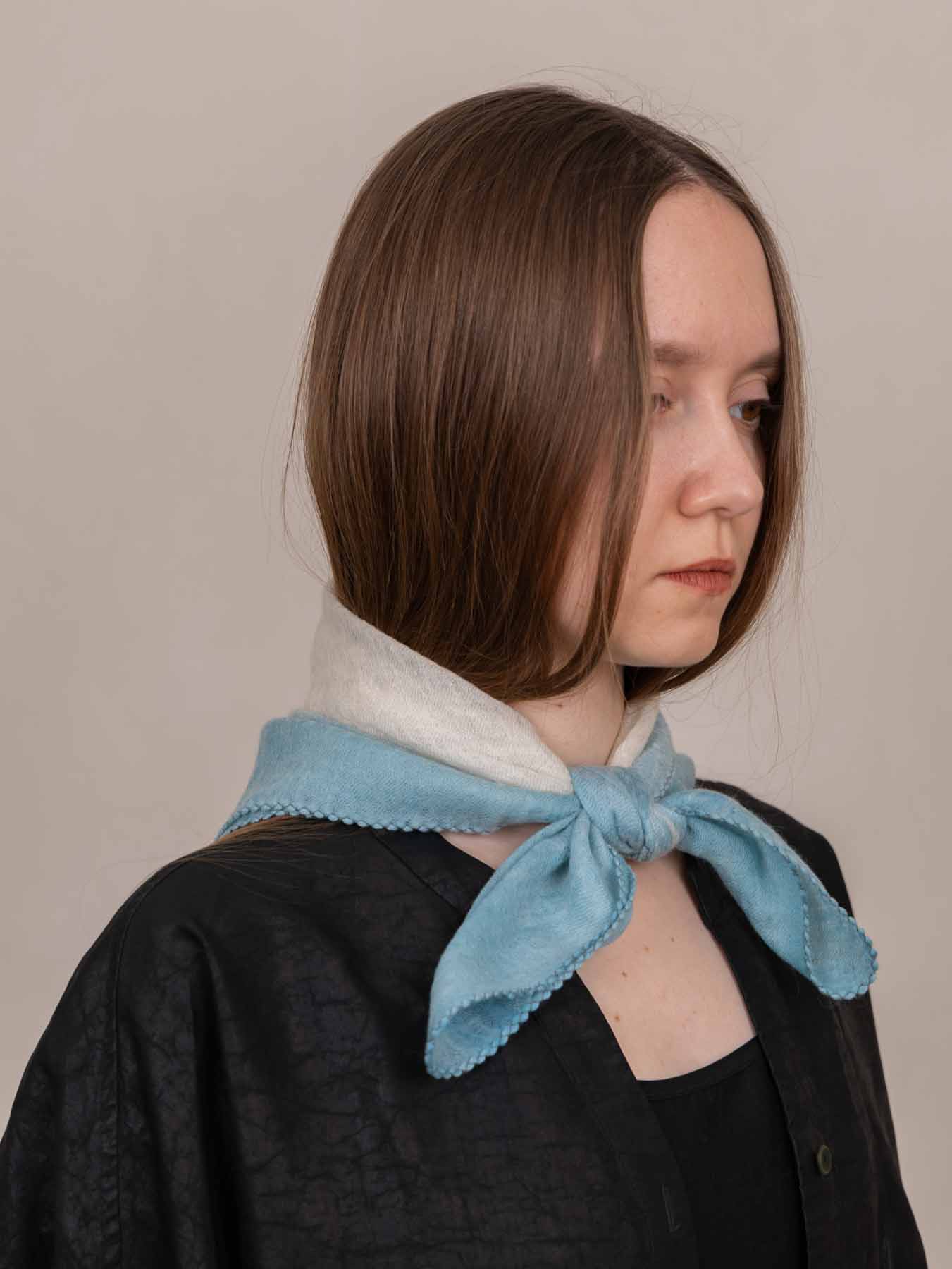 Muse is lighter than a feather and softer than a kiss. It is designed to carry you from early spring through late autumn. Hand-dyed in a soft mint tone, it creates gentle, natural variations and arrives with an embroidered storage pouch. This foulard is a 60 × 60 cm square, made from 100% cashmere.